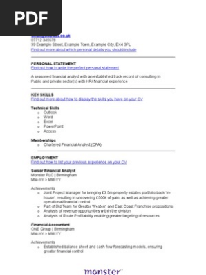 As a financial analyst, you have the opportunity to work in a variety of areas, including finance, business, and your financial analyst resume should include areas that you specialize in, like risk management or mortgages, and it should provide proof that you. Looking for financial analyst cv template cv samples examples? This financial analyst cv example, as well as the included writing guide and tips, will make it much easier for you to get started on your own cv. Here's what stand out about this candidate's cv: Free download of financial analyst cv template document available in pdf format!